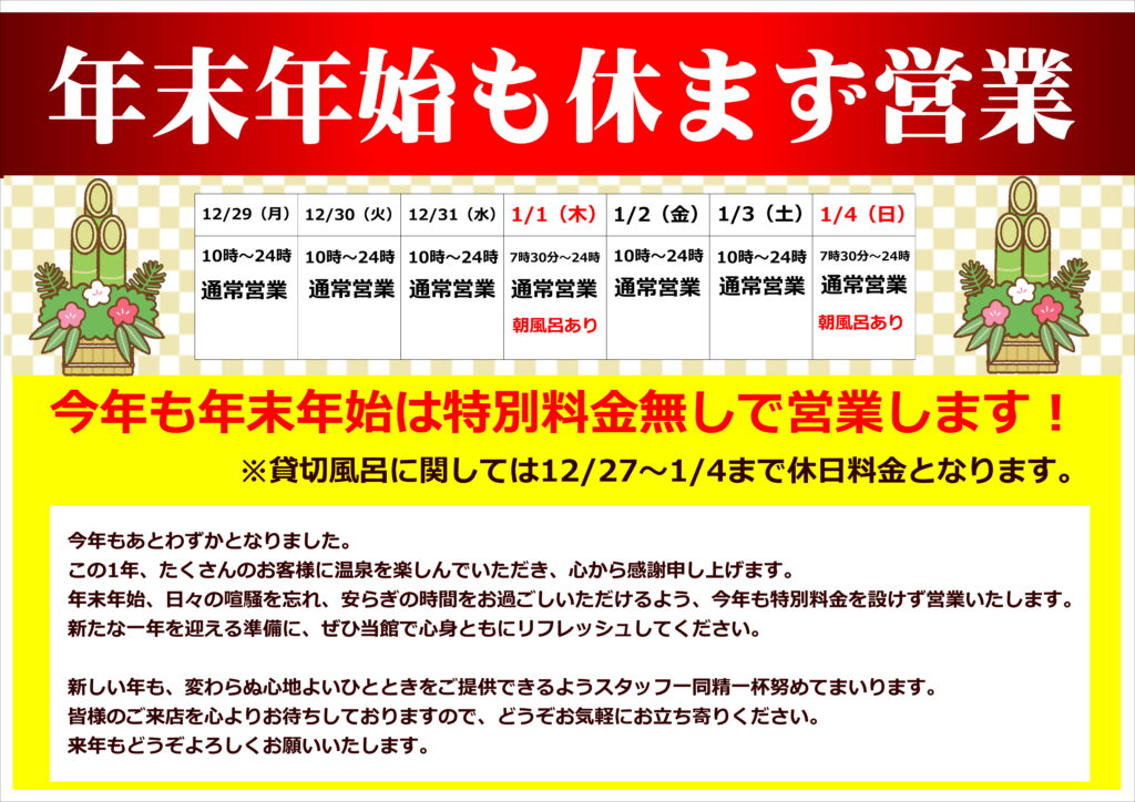 なお、年末年始期間の貸切風呂は全て休日料金とさせて頂きます。