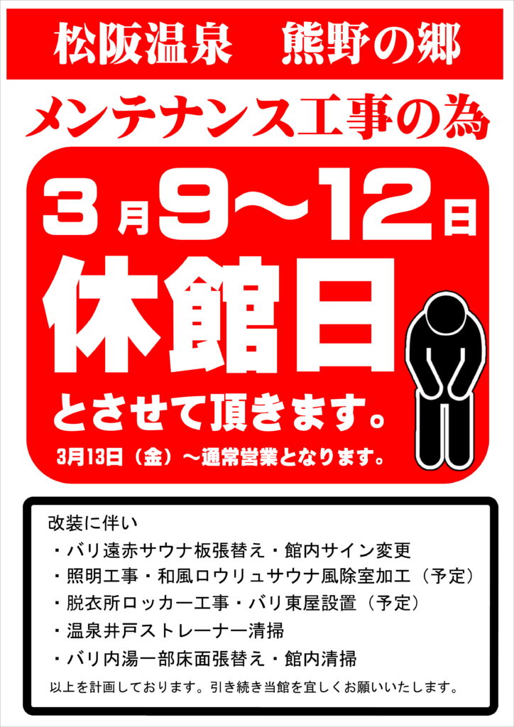 3月9日(月)~3月12日(木)の期間中はメンテナンス休業とさせて頂きます。