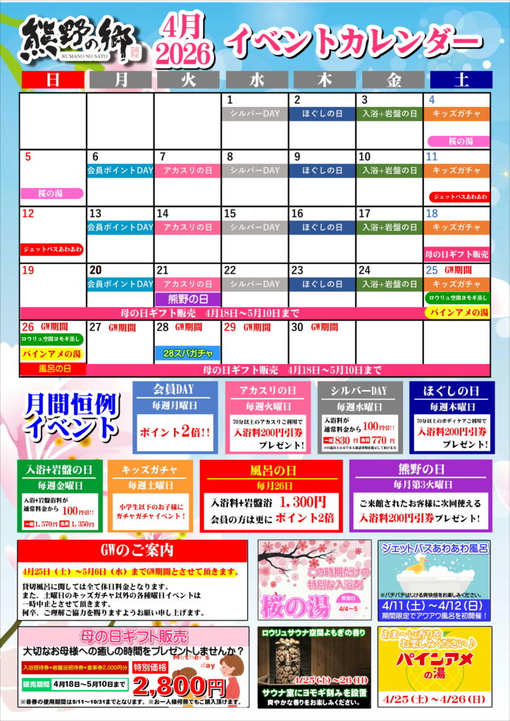 今月は特別なイベントが盛りだくさん!この時期ならではの桜風呂🌸で春を感じながらしっとりと温まるひととき。そして、お子様に大人気のパインアメ風呂🍍は心を跳ね上がらせること間違いなし!さらに、アワアワのジェットバスやよもぎ蒸しの香りが初登場するロウリュサウナでリラックスした時間をお楽しみいただけます🛁✨