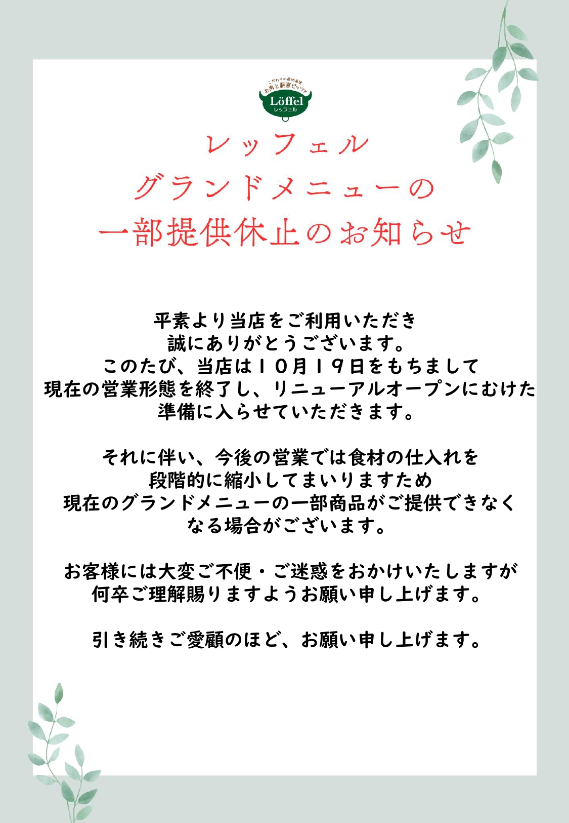 レッフェルグランドメニュー一部提供休止のお知らせ