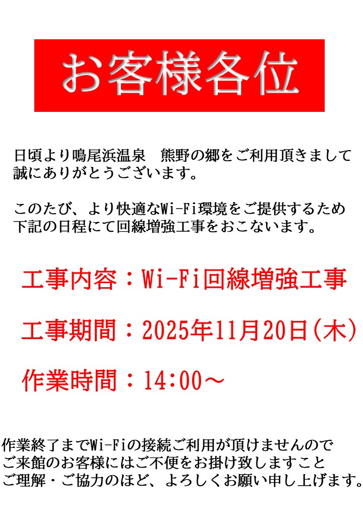 Wi-Fi回線増強工事のお知らせ